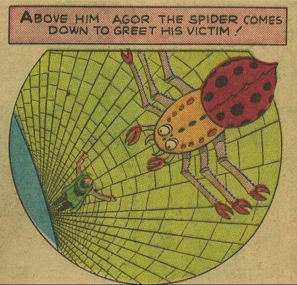 Agor was a huge spiderlike creature that resides in the temple of the man eating spider in the Himalaya mountains. The creature had its web over an abyss near a balcony to the temple. The bottom of the abyss had a deep well containing a giant octopus. Agor came into contact with Merlin the Magician when he came in search of the giant diamond on the forehead of the Khotan Buddha statue in the temple. Caught in the spiders web Merlin used magic to transform into a huge "Mickey Finn" which the spider (which has been said to more greatly resemble a crab) partly ingests, becoming intoxicated and falling into the well with the octopus.