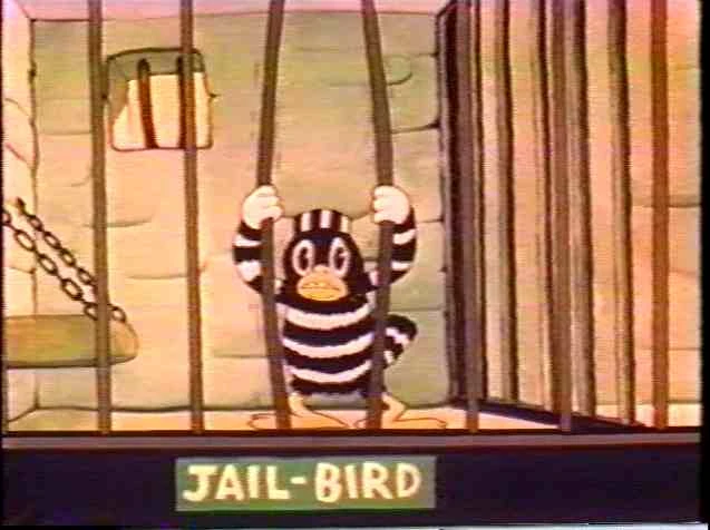 The "Alcatraz jail-bird" is a criminal bird with a voice like Edward G. Robinson claims innocence, "I didn't do it, I tell ya!" In the cage next door, the "stool pigeon", in a somewhat effeminate voice, retorts, "Oh, he did so do it; I saw him with my very own eyes; so there!'