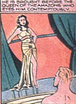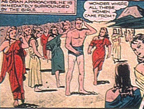 The Amazons are ruled by a queen who dealt with outsiders, such as Oran, by placing them into gladiatorial matches with her pet a giant reptile resembling a dinosaur or dragon. A mutual attraction between Oran and the Amazonian Queen was seemingly developing, but never the less the queen threw the handsome newcomer to the beast lest he interfere with her plans.