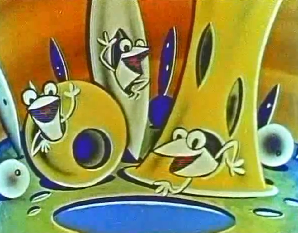 The Frog Men have triangular shaped white bodies. They have black eyes and big mouths with a maroon inner-cheek and a pink tongue. They wear no clothes.