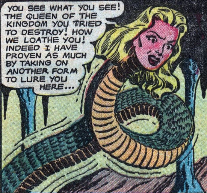 In little time, Lawrence becomes infatuated with Asptha. On a walk together, Asptha slips and falls into a snakepit. Lawrence descends to rescue her, finding them both surrounded by various snakes. Asptha reveals she is Queen of the Snakes by returning to her snake form. She tells Lawrence she and her snakes all loathe him. Fighting a desperate battle, Lawrence Mason succumbs to the poisonous brood.