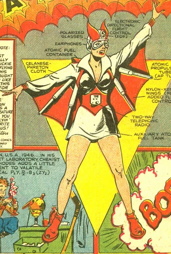 While Atoma has no super-powers, she does wear EDF (electronic directional flight) control nylon-xenton wings which allow her to fly.