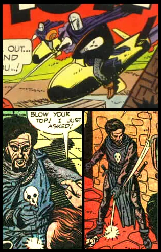 As The Black Knight, Conrad led his men on raids of banks, armored cars and the like, operating out of a castle he had built many years before. The Black Knight and his men rode on flying rocket sleds and carried electrified lances and swords that could smash through the door of a safe. They all wore chain mail armor and carried a shield, which made them impervious to the bullets of conventional firearms.