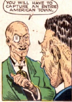 Blitz was a bald, monocle wearing Nazi agent who hired the Smiler to retrieve an invention wanted by the Third Reich. Blitz already possessed a device that fires lightning bolts and a small tear-gas gun, but needed another invention. Smiler and his gang kidnap the inventor and secure the item, but they are stopped by Captain Fight.