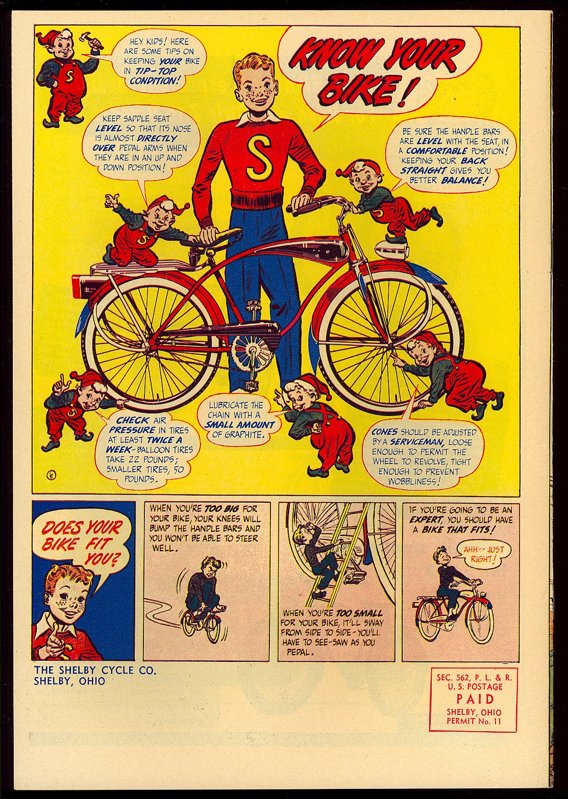 Bobby Shelby was the mascot for the Shelby Cycle Company appearing in half-page comic strips within comic books throughout the late 1940s and early 50s. Originally, he would merely teach bike safety however, he did eventually star in his own self-titled, mail-in comic.