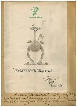 Bolivar the Talking Ostrich is a talking ostrich with thick bowlegs, tiny wings, a derby/top hat, and he smoked cigarettes. The character appeared in sound shorts created by Walter Lanz for Movietone Pictures such as Blue Notes.