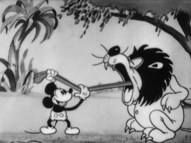 The Dancing Lion was encounter by Mickey Mouse after he wanders into a jungle and comes across several animals, including elephants, monkeys, and bears. A monkey and parrot begin playing a tune on Mickey's accordion, and it turns into a concert for the jungle animals. Mickey dances with a lion, a bear and a pair of monkeys to the tune of Johann Strauss' The Blue Danube. Then two ostriches dance as Mickey plays "Auld Lang Syne" on a makeshift saxophone. Mickey continues with "Aloha 'Oe", "Turkey in the Straw" and "Yankee Doodle", and the animals applaud.