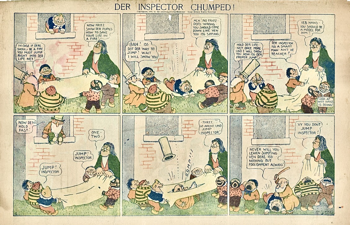Stern, dutiful, yet often hapless. His dedication to enforcing school rules makes him the ultimate nemesis for the mischievous twins, who unfairly see him as “Der Goat.” Despite his authority, he seldom succeeds, earning the boys’ mocking contempt. He’s known for the exasperated line, “Mit dose kids, society is nix!” (“With these children, society is doomed!”), becoming a standard gripe reflecting adult frustration in the series