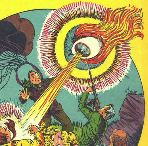 The strange being known as The Eye appeared as a speaking, flaming eyeball in the sky. It had the power to generate deadly rays of heat, expand and shrink, fly and hover, project a searchlight beam, and appear just about anywhere. It often teamed up with Jack Barrister to fight crime. Space and time meant nothing to the Eye, and could use this fact to help bring justice to the entire world.