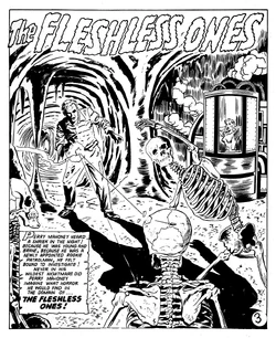 - The Fleshless Ones has been reprinted several times by various publishers. Atlas swiped the story wholesale, altering the artwork but retaining the title and dialogue, for Mystic No. 64 (November 1957). More recently, AC Comics acquired the rights to the story, issuing an authorized reprint in the first issue of Crypt of Horror, an omnibus-style magazine using material from numerous pre-code comics.