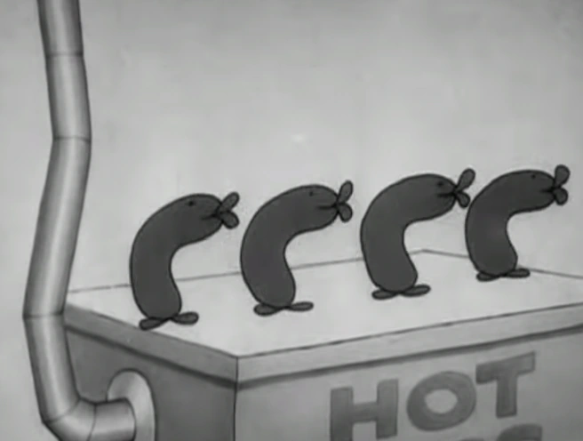 The Hot Dogs are also involved in several gags and jokes throughout the film. For example, one of them escapes from Mickey's cart and runs into a tent where a lion tamer is performing. The lion tamer mistakes it for a sausage and tries to feed it to the lion, but the hot dog bites the lion’s nose and runs away. Another gag involves Mickey using a hot dog as a harmonica to play music for Minnie.