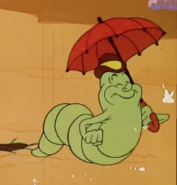 Inchy Worm is a small Inchworm that gets chased by Wolfie at the end of The Old Shell Game. In The Oily Bird, all the creatures are settling in for the night including Inchy the worm. The Hawk tries to lure Inchy from his bed with flute music, placing him in a cook pot. Inchy escapes, only to have more attempts made on him. The hungry hawk offers him a peace treaty after tangling with a beehive. Many more attempts are made before Inchy defeats The Hawk, signified by the playing of "Taps."