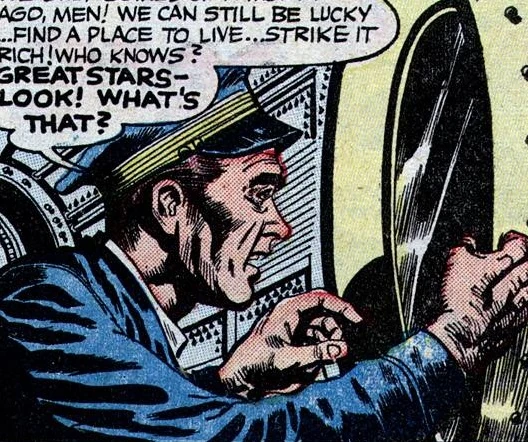 The Lorelei is a barren, rocky planetoid with an enormous face of a beautiful woman carved on its surface. Captain Jark Hudson sees the monument, recalling the Greek legend of the Lorelei who lured Ulysses. Like the legend, he is hopelessly lured into the planetoid. As Jark and his crew members Brody and Small land, they note the eyes of the carved face contain jewels. Greedily, the space-weary move toward them. A trapdoor opens beneath them, and the three men fall into an enormous web of Giant Spiders.