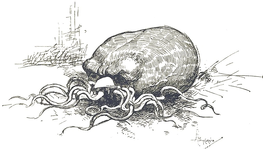 The Martians are roughly bear-sized, land-based cephalopod-like creatures, with most of their body consisting of a large bloated head internally housing its massive, highly-advanced brain. They lack a skeletal system and utilize a series of long, whip-like tentacles to crawl around on.