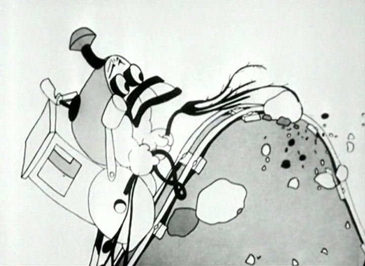 The engine slowly starts out of the station and chuffs cheerfully through the beautiful countryside toward a hill and struggles up it. The engine ends having problems and starts to cry until the cartoon ends with Mickey pushing the boxcar too hard that it comes loose from the engine, runs into the Cow, and explode.