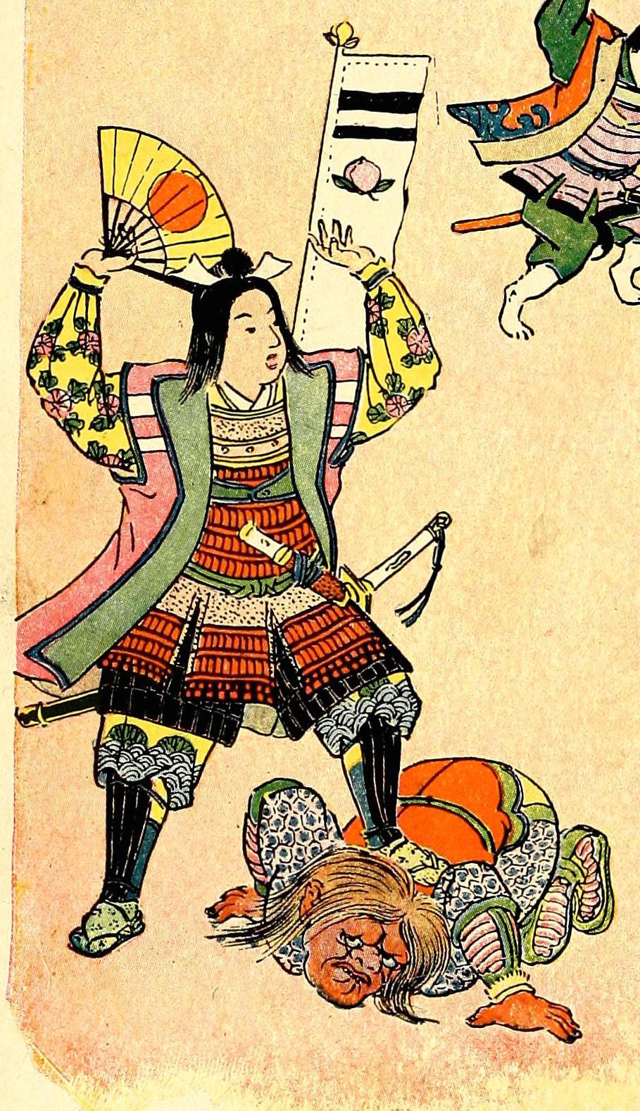 When a poor, childless couple find a huge peach floating down the river, they bring it home with the intent of eating it but are shocked to find a child inside it who claims to have been sent to them from Heaven. They name him Momotaro and raise him, and he later goes out on his first adventure: fighting hostile Oni (variously described in the English‐language stories as demons, devils, spirits or monsters) on their island with (in most versions) the help of talking animals—a dog, a monkey and a pheasant—that he encounters on the way. The leader of the oni is sometimes named as Akandoji.