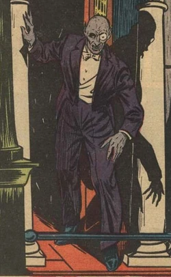 The Monocled Monster was a vampire who found the Shield's sidekick, Dusty, a worthy recruit for his "Legion of Vampires." When the Monocled Monster went after Dusty and Mamie Magda, the Shield and his friend, Ju Ju Watson, chased the monster into a graveyard and drove a stake through his heart.