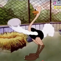 Mother Ostrich is a female Ostrich on her nest, clucking like a chicken, stumbles and breaks her large egg, which contains a dozen chicken eggs, and the narrator comments, "Well! A jackpot!"