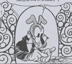 Mr Kurrency is an anthropomorphic dog and bank teller who first-appeared in Mr Slicker and the Egg Robbers. He only appeared in one strip of the story, helping to setup a gag about Mickey getting a torn dollar bill repaired in a tire repair shop. Mr Slicker and the Egg Robbers is his only known appearance. In 1930, Mr Kurrency was working as a bank teller at a bank presumably located in Mouseton. One of his customers was Mickey Mouse, who deposited his earnings from his miniature golf course in the bank at which Mr Kurrency worked.