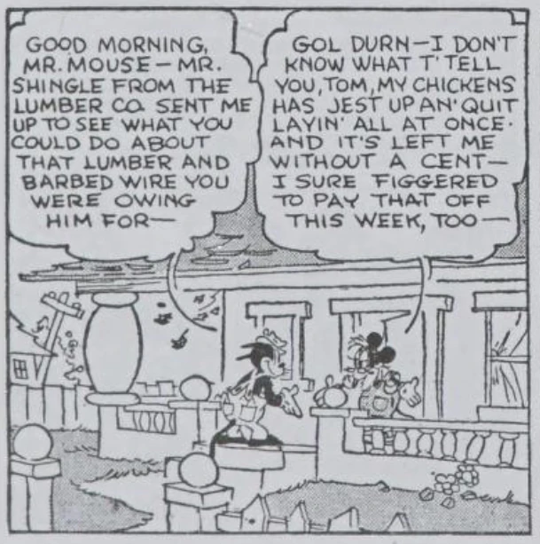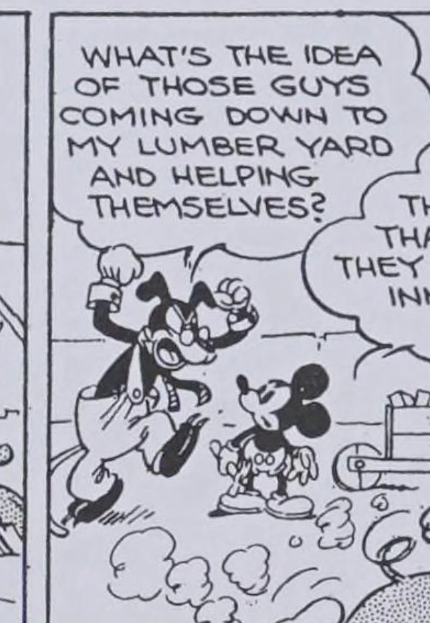 - In the strip from the story initially released on September the 25th, 1930, an anthropomorphic dog appeared and complained to Mickey Mouse about lath and bricks having been stolen from his lumber yard by a non-anthropomorphic goat and pig that were helping Mickey out in his building of Mickey Mouse's Miniature Golf. Mr Shingle and the unnamed dog both have in common a connection to lumber and a presumed close proximity to Mouseton, though it is unknown if the two characters were actually intended to be the same.