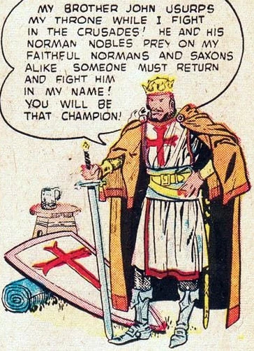 In the story of Ivanhoe, Richard returned to England, hiding his identity from Prince John as the mysterious Black Knight. Later, he aided Robin Hood in saving Ivanhoe and his companions from the castle.