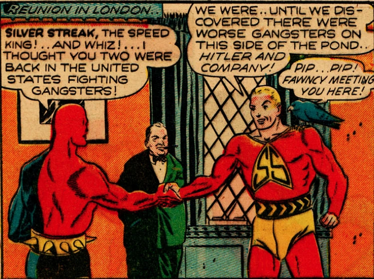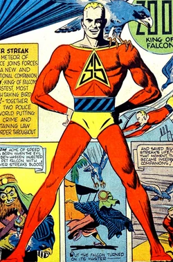 A taxi driver was hypnotized by a swami who enjoyed building race cars. The swami's best race car, the Silver Streak, seemed to be targeted by someone or something, for every time someone drove it, they were attacked and killed by a giant insect. The taxi driver was attacked and killed, but the swami brought him back to life and put him behind the wheel of the Silver Streak to find the bad guy. Then he became a costumed hero with a "secret fluid" in his blood which allowed him to defy gravity. One peculiar trait - Silver Streak's powers can be transferred to others through blood transfusions. That is how both his sidekick(s), Mercury/Meteor, and his pet falcon, Whiz, received their powers.