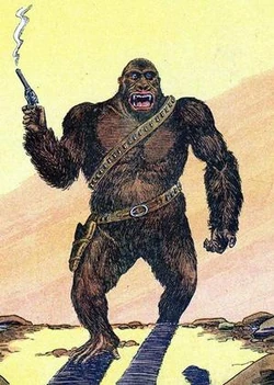 Unfortunately, Bart Masters was murdered by Tutt Strawhan, leader of the Strawhan Gang, in order to learn what Masters knew about "the great mother-load." O’Neil swore revenge on his master's killers and set out armed and dangerous to kill every member of the Strawhan gang. With only his bandoleer and two six-shooters, the ape tracked down and killed the murderers one by one. However, the Six-Gun Gorilla died just as he killed his nemesis Tutt Strawhan.