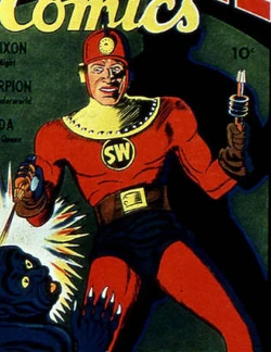 Normally, Sky Wizard was a non-powered man whose greatest strength was his scientific genius. In Miracle Comics #1, he created a drug that temporarily boosted his strength and speed.