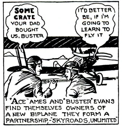 Ace Ames and Buster Evans owned and operated the Skyroads Unlimited transport company. They were soon joined by Peggy Mills, a fearless young aviatrix. The trio received a significant boost when Peggy's father, a visionary tycoon, offered to fund an aerial expedition to the Amazon, motivated by scientific interests.