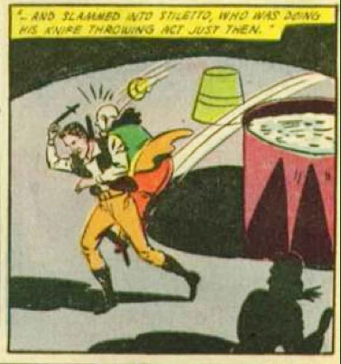 Stiletto was a circus performer who was framed for the death of Pogo the Clown. The fact is, Pogo hated the knife throwing rival so much that when he committed suicide, he thought he would have the last laugh by making it look like he was stabbed by Stiletto instead. This was proven false by the investigation of Kip Burland better known as the Black Hood.