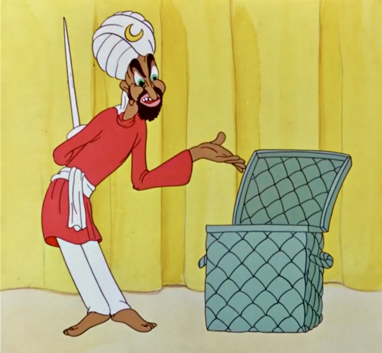 Swami River is portrayed as an exotic, mystic showman - a tongue‐in‐cheek stereotype of Eastern spiritual types of the era. He appears as a pompous, self-styled "Hindu Mystic" who performs a basket trick. His act involves calling an audience member (in this case, Egghead) to step into a wicker basket, after which he dramatically impales the basket with a sword several times. The trick, of course, goes humorously awry when his volunteer fails to cooperate as expected, being fatally wounded by the mystic's blade, forcing the Swami to refund the money he earned for the act.