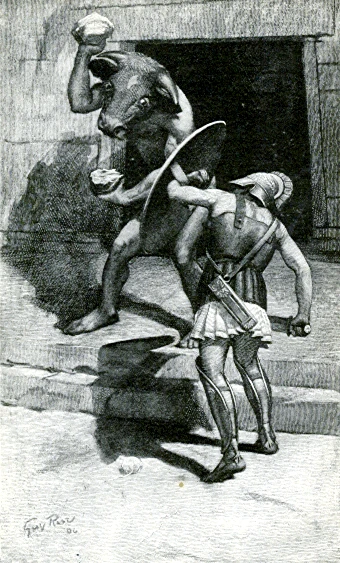 On the third occasion, Theseus volunteered to talk to the monster to stop this horror. He took the place of one of the youths and set off with a black sail, promising to his father, Aegeus, that if successful he would return with a white sail. Like the others, Theseus was stripped of his weapons when they sailed. On his arrival in Crete, Ariadne, King Minos' daughter, fell in love with Theseus and, on the advice of Daedalus, gave him a ball of thread (a clew), so he could find his way out of the Labyrinth. That night, Ariadne escorted Theseus to the Labyrinth, and Theseus promised that if he returned from the Labyrinth he would take Ariadne with him. As soon as Theseus entered the Labyrinth, he tied one end of the ball of string to the doorpost and brandished his sword which he had kept hidden from the guards inside his tunic. Theseus followed Daedalus' instructions given to Ariadne: go forwards, always down, and never left or right. Theseus came to the heart of the Labyrinth and upon the sleeping Minotaur. The beast awoke and a tremendous fight occurred. Theseus overpowered the Minotaur with his strength and stabbed the beast in the throat with his sword (according to one scholium on Pindar's Fifth Nemean Ode, Theseus strangled it).