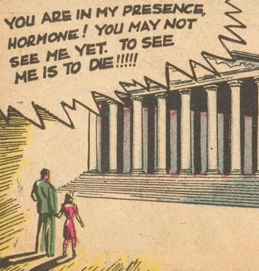 The Thinker was a disembodied voice that summoned Doctor Hormone and temporarily endowed him with superhuman powers to fight off an invasion of Texas by the Nazians. Then, The Thinker lured Doctor Hormone and Jane into a mysterious gorge where they descended into the Chaos and fell into a state of suspended animation. The character has not appeared since.