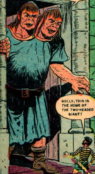 Thunderdel is a two headed giant from Cornwall who sought vengeance against Jack the Giant Killer and came hunting for him, saying "Fee Fau Fum." Jack killed and beheaded him using a trick involving a mote and a drawbridge.