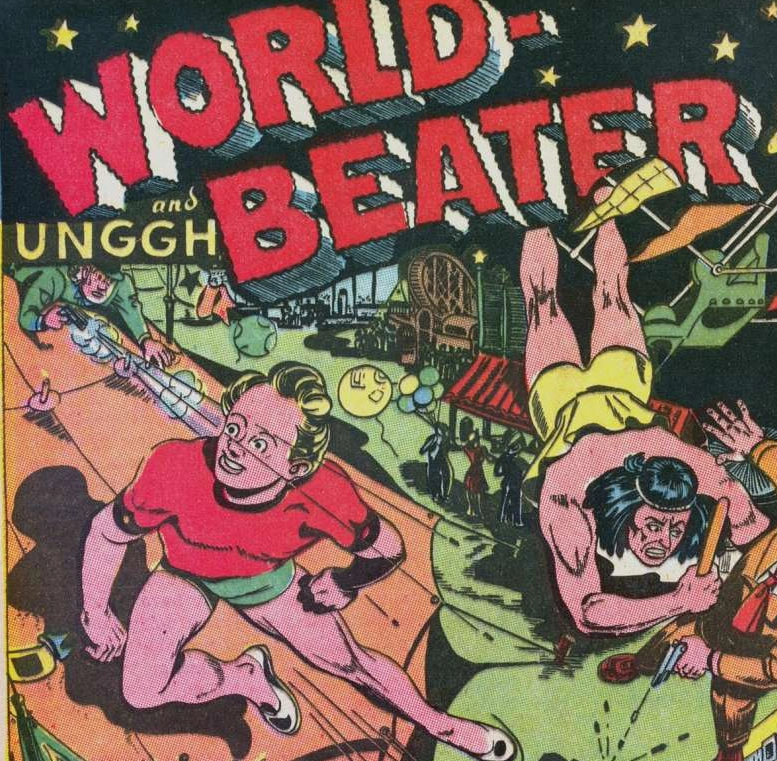 Worldbeater was a time traveler who had adventures alongside his caveman friend Unghh. Their adventures included trying to make invisible paint, getting a job at a carnival as a swami act, going to Hollywood, and creating a spray that brings inanimate objects such as dolls to life.